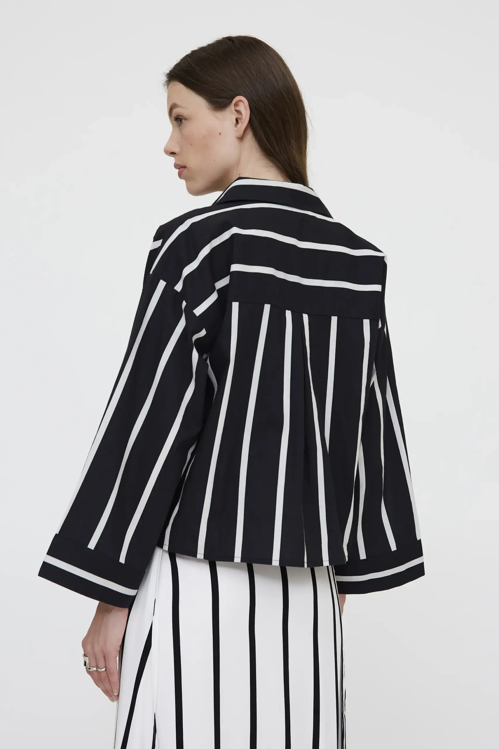 Camisa fluida de tejido 100% algodón con estampado Grimaud Black. Cuello solapa y escote pico. Manga larga amplia. Hombros ligeramente caído. Cierre frontal con botones. La modelo mide 178 cm y lleva la talla S