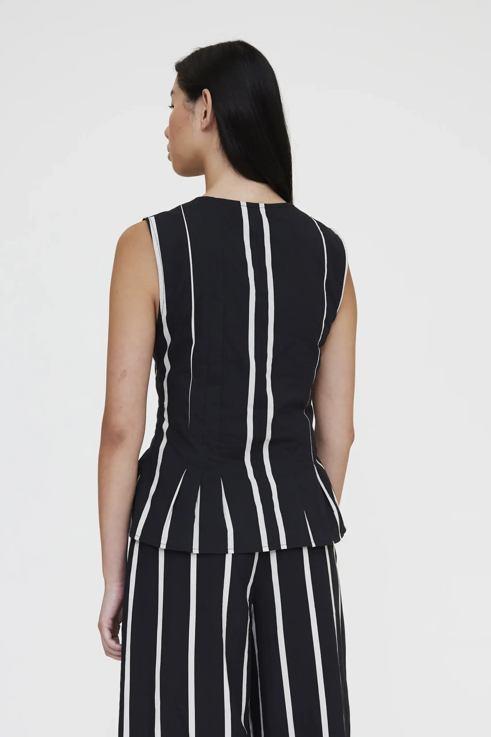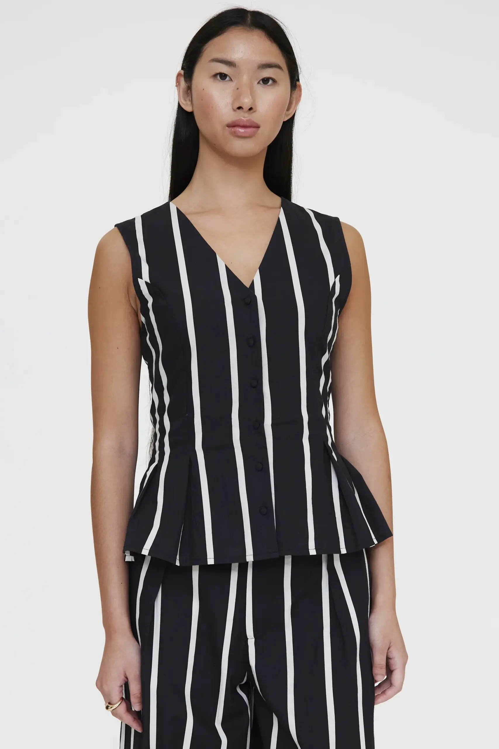 Chaleco de tejido 100% algodón con estampado Grimaud Black. Cuello pico y sin mangas. Cierre frontal con botones forrados negro. Detalle de plisado.Forro interior. La modelo mide 173 cm y lleva la talla S.