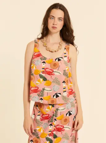 Camisa de cuello solapa y manga corta. Cierre con botones frontales. Estampado de corazones místicos. Tejido 100% algodón.