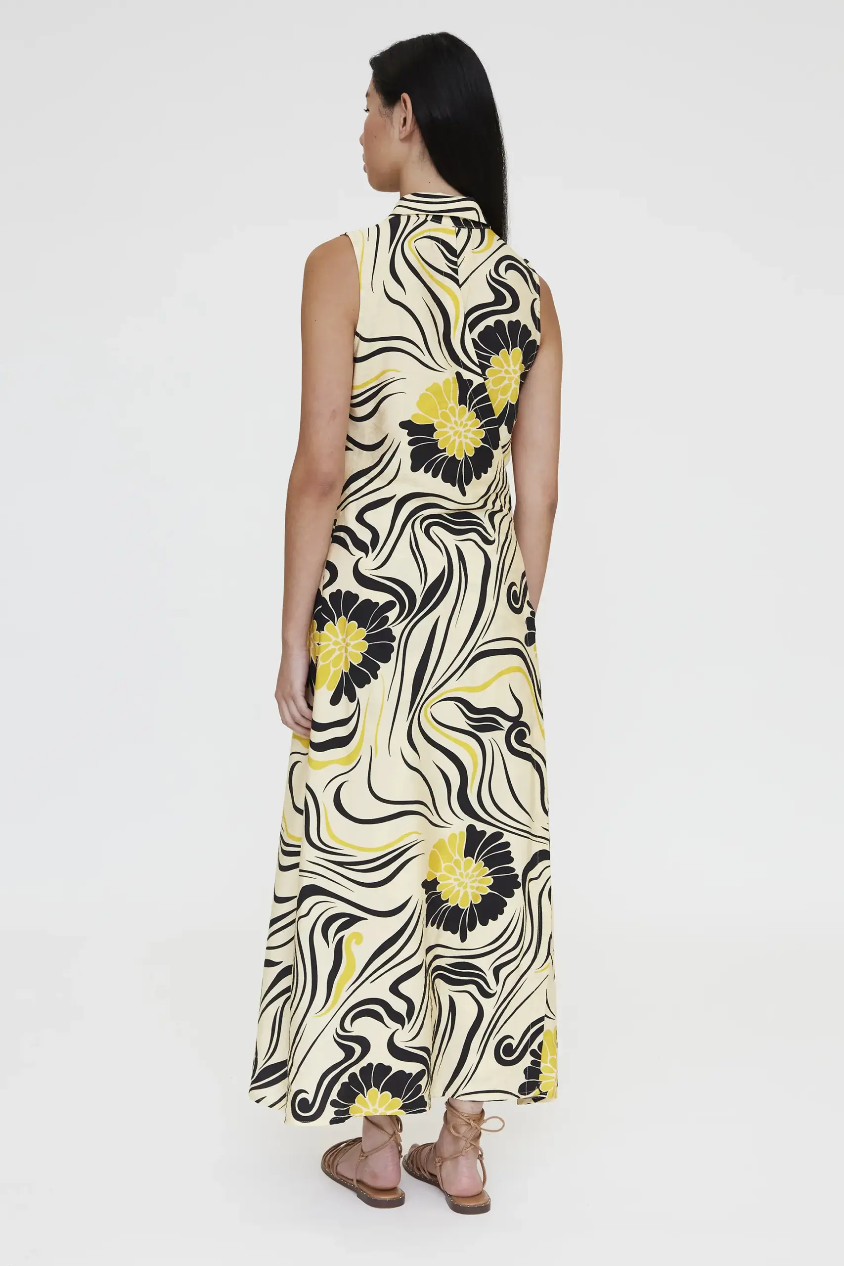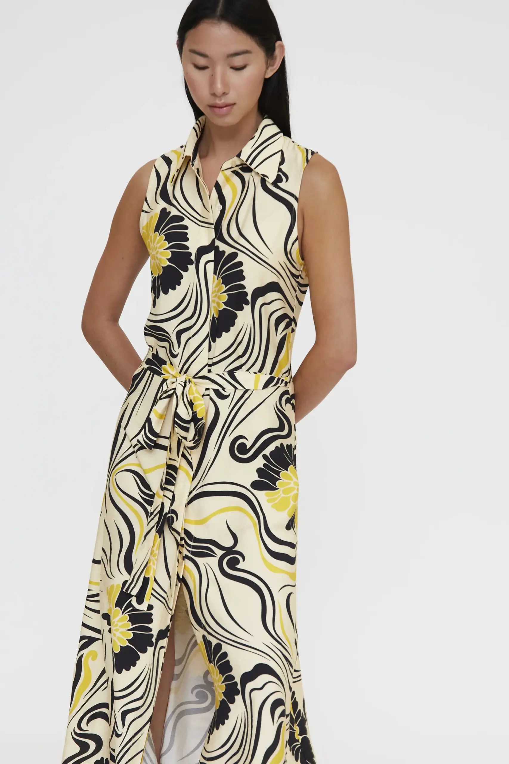 Vestido largo de tejido crepé con estampado Praga. Cuello solapa y sin mangas. Cierre frontal con botones ocultos. Cintura lazada. Ligera abertura frontal. La modelo mide 173 cm y lleva talla S.