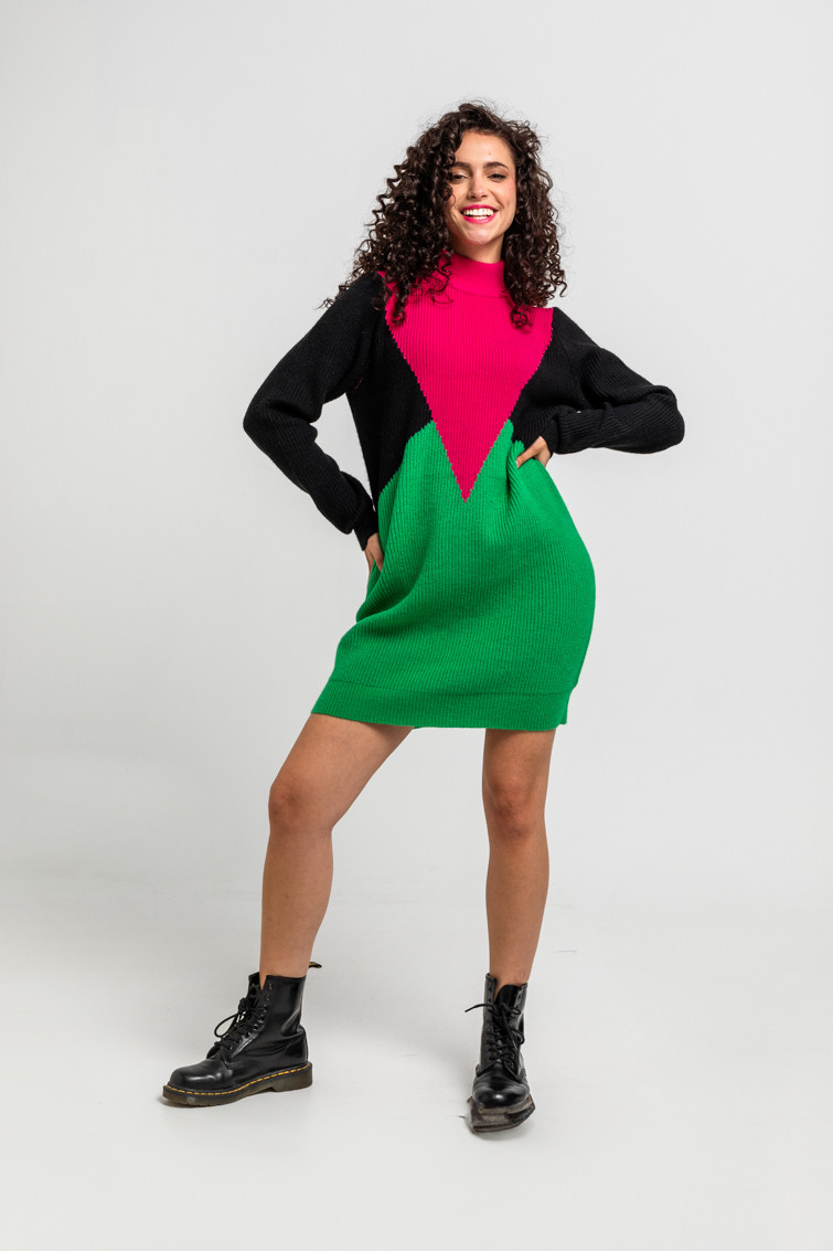 Vestido tejido tricolor fucsia, negro y verde - Más rara que cantidad